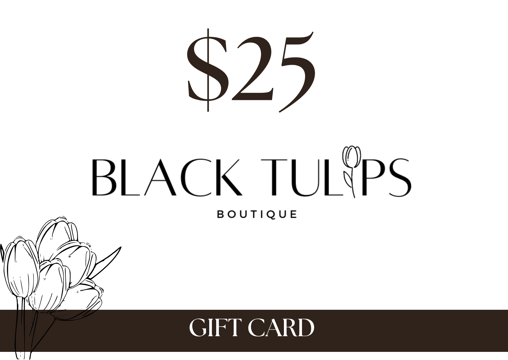 Give the gift of elegance with a Black Tulips Boutique Gift Card. Perfect for any occasion and endless possibilities. Let that special someone choose from our curated collection of exquisite clothing. The Black Tulips Boutique Gift Card—because nothing says ‘you’re special’ like the gift of style."