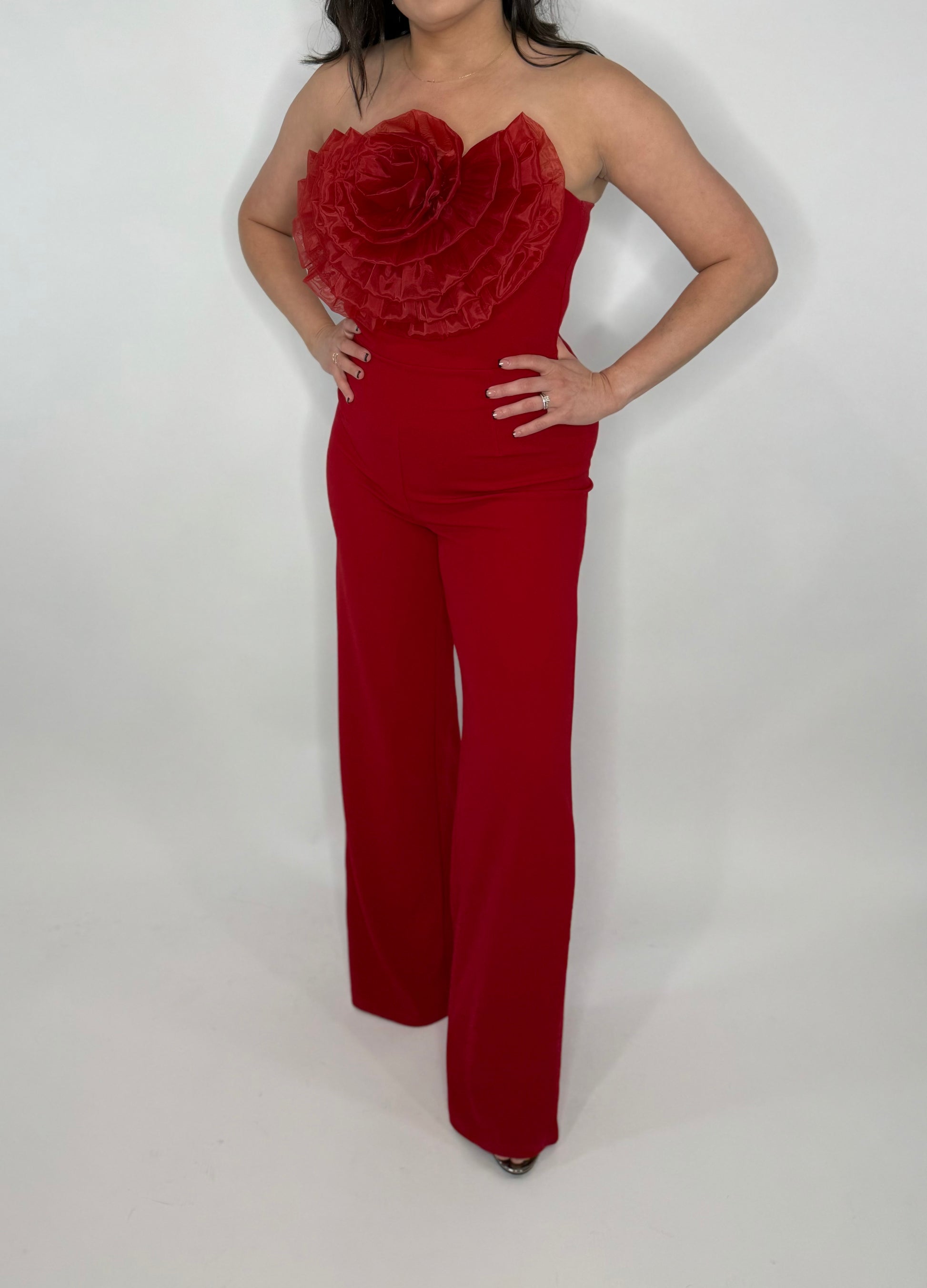 Organza Flower Detailed Fashion Jumpsuit - Red