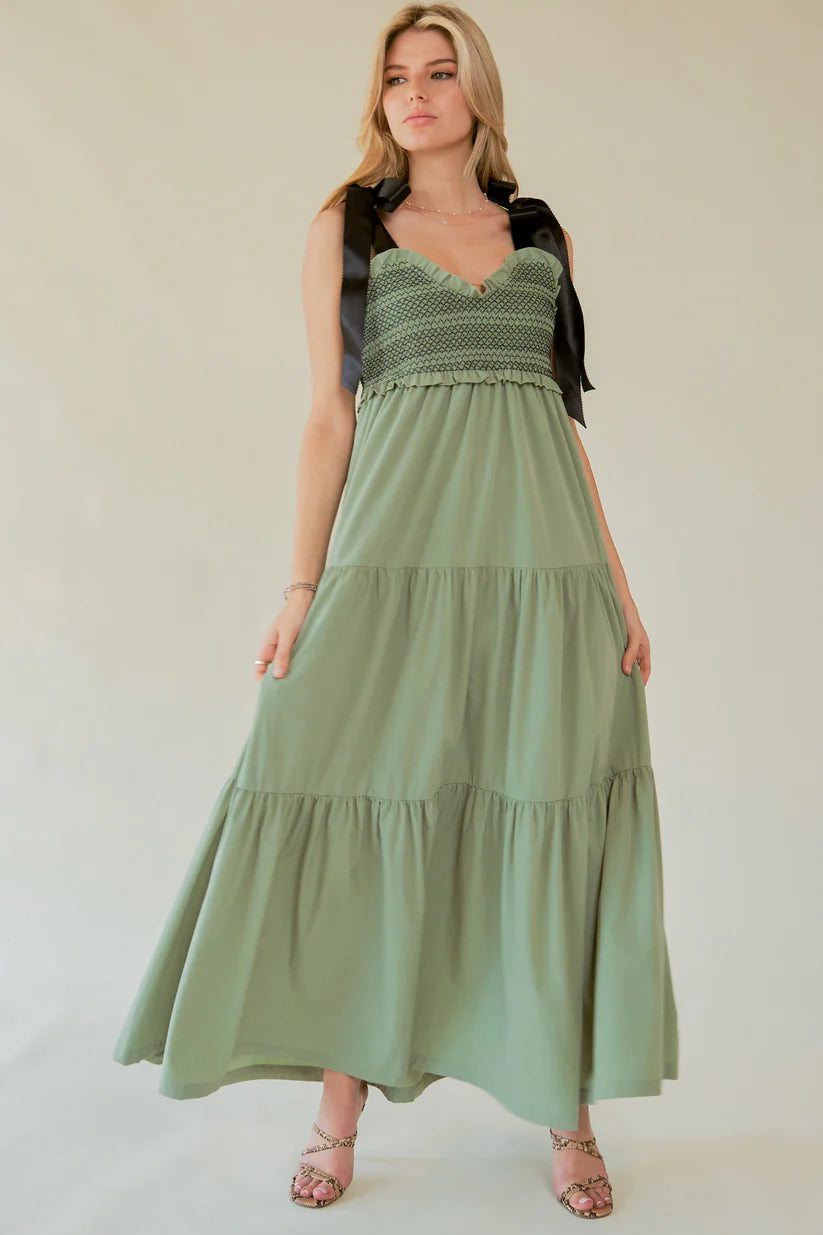 Smocked Bodice And Bow Tie Straps Maxi Dress